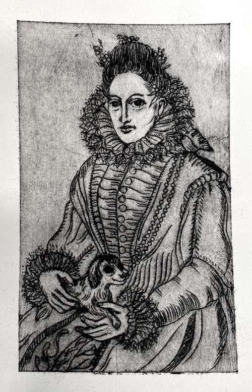 Tetrapak-Druck (5×10 cm), Adaption, Porträt einer Dame mit Schoßhund,