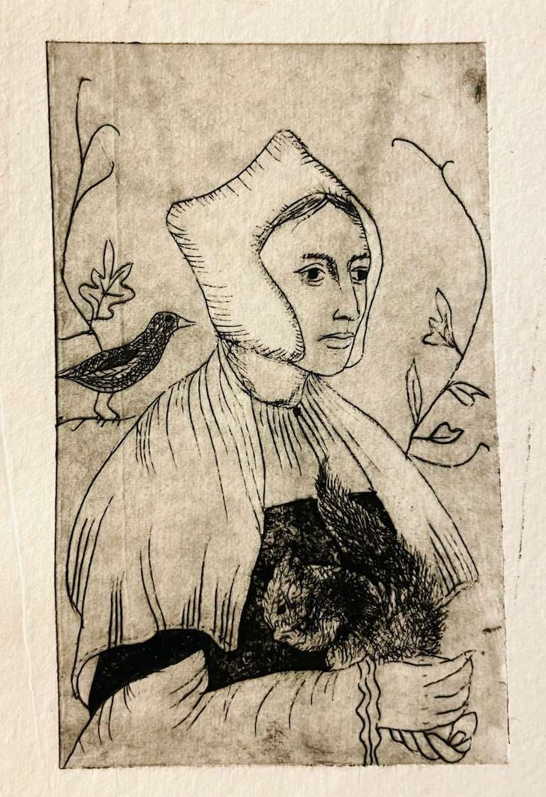 Bild 2: Tetrapak-Druck, Adaption nach Hans Holbein d. J., "Porträt einer Dame mit einem Eichhörnchen und einem Star", wahrscheinlich Anne Lovell, 1526 —