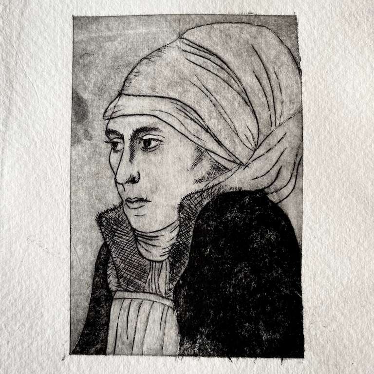 Langsam wurde ich sicherer im Umgang mit dem Material. Details musste ich weglassen – oder zumindest reduzieren. Ein kleiner Satz Stanzeisen und ein Gummihammer erweiterten mein Werkzeug, damit konnte ich auch aufwändige Kleidungsornamente und Schmuckstücke der Renaissance-Frauen in vereinfachter Form darstellen. Dabei stieß ich bald auf Hans Holbein den Jüngeren. Besonders die Kopfbedeckungen der Frauen in seinen Gemälden faszinierten mich. Begriffe wie „Jungfern-Schapel“ konnte ich nicht einfach überlesen. Ich wollte wissen, was das genau bedeutet – und schon führte eins zum anderen.