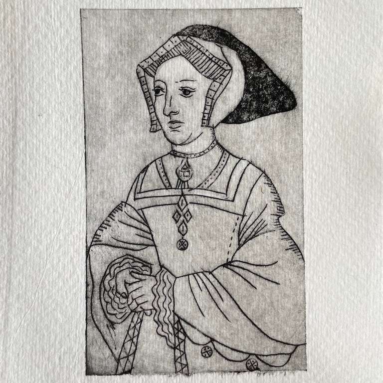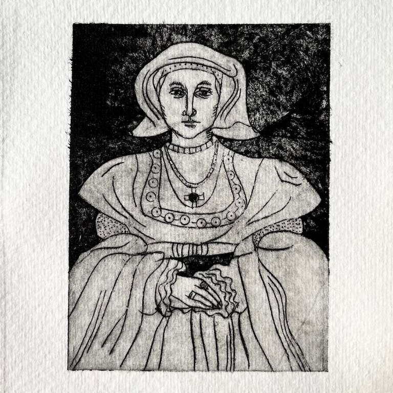 So entstanden kleine Erklärungen, die sich schnell zu Mini-Essays auswuchsen. Dazu kam eine eigensinnig-spielerische Auseinandersetzung mit der geschriebenen Kunstgeschichte: Wie viel lässt sich überhaupt über die dargestellte Frau herausfinden – in einer männlich dominierten Kunst- und Geschichtsschreibung? Im Fall der Frauen Heinrichs VIII. natürlich viel! Recherche liegt mir, und so nahm die Sache Fahrt auf, und plötzlich war ich mittendrin in einem ganzen Kosmos von Frauen, Bildern und Geschichten.