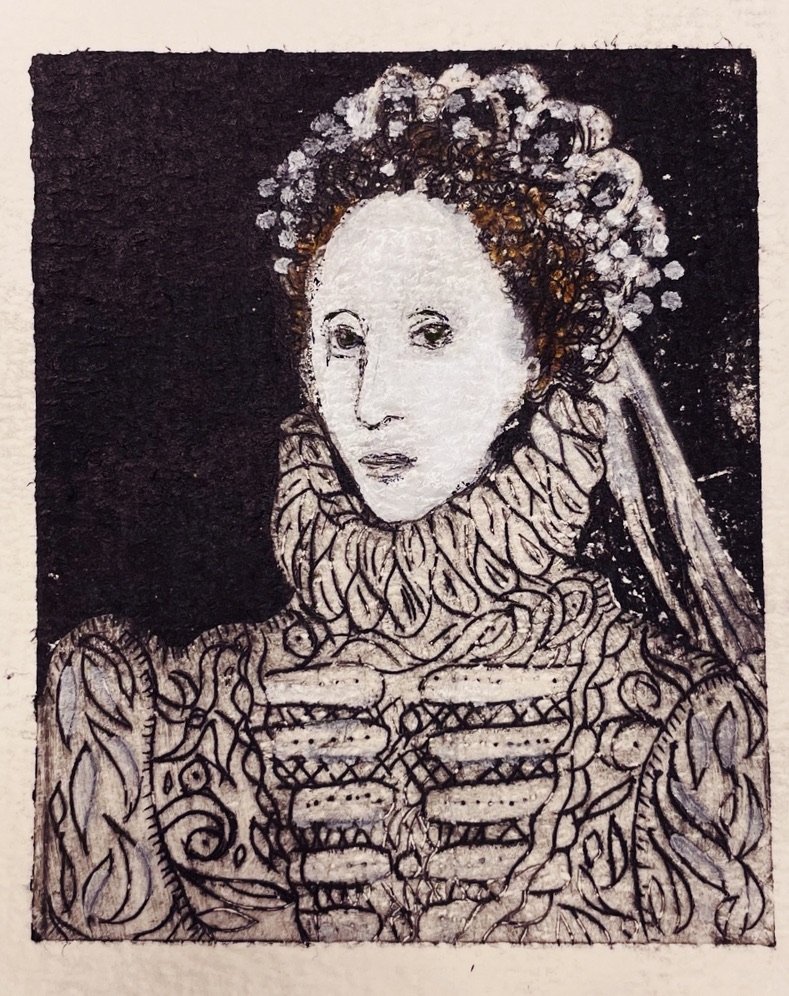 Anlass war der Druck von Elizabeth I. Mit der Radiernadel hatte ich mich in den Verzierungen und dem Geschmeide völlig verfranzt. Die Drucke waren nicht wirklich gelungen, eigentlich war da nichts mehr zu retten. Dann ging ich mit vielen Schichten, vor allem weißer Farbe über das Gesicht. Dass die Vorlage, das Darnley-Porträt von 1575, auch „Mask of Youth“ genannt wurde, passte wiederum so gut, dass ich es schließlich doch veröffentlichte.