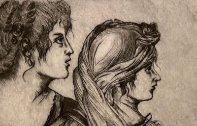 Kaltnadelradierung, Zink (9 × 7,5 cm), Druck, Adaption, Detail: Judit mit ihrer Zofe, A. Gentileschi, um 1612 — Gleichgestellt sind sie nicht – Judit und ihre Abra. Judit mit kunstvoller Flechtfrisur, das Schwert lässig über…