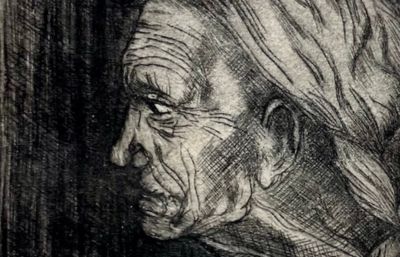 Kaltnadelradierung, Zink, (5x5 cm) Druck, Adaption, Detail: Judith enthauptet Holofernes, Caravaggio, um 1599 — Es scheint auf den ersten Blick eindeutig: Caravaggios Abra ist alt und hässlich, um Judiths Jugend und Schönheit stärker hervorzuheben. Aber…